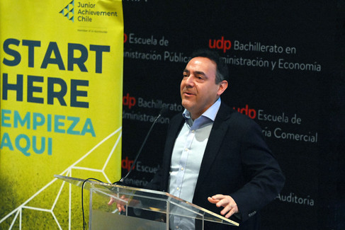 El Decano de la Facultad de Administración y Economía de la UDP, Mauricio Villena, destaca la importancia de capacitarse para emprender en un mundo impulsado por los avances tecnológicos. Por su parte, Noël Zemborain, presidenta de Junior Achievement Américas, compartió su propia experiencia de vida, instando a los jóvenes a soñar en grande y a perseguir sus pasiones con determinación.